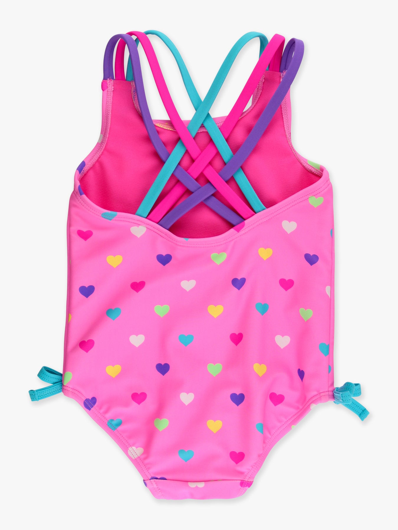 This bestselling heart pattern is a hit with girls of all ages! This sporty yet sweet style is perfect for all-day play! The UPF 50+ fabric offers superior sun protection, and the multi-color straps and bow accents at the legs add a girly touch.