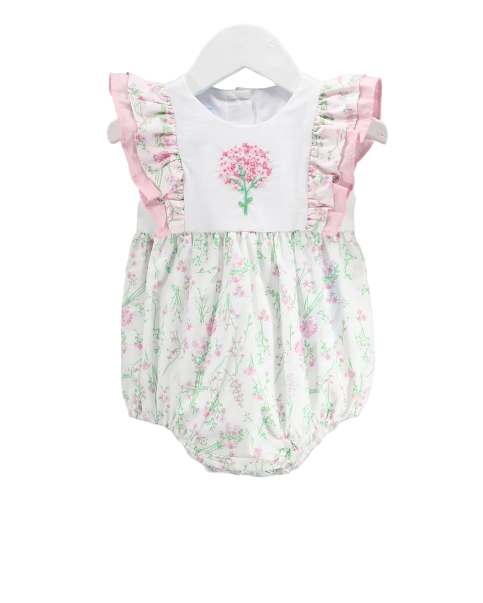 This embroidered baby girl romper is a sweet blend of classic charm and modern boutique style. Designed with a soft white bodice, it features a delicate pink floral embroidery at the center for a timeless, heirloom-inspired look. The flutter sleeves are accented with ruffled pink trim and coordinating floral fabric, adding a feminine and playful touch.