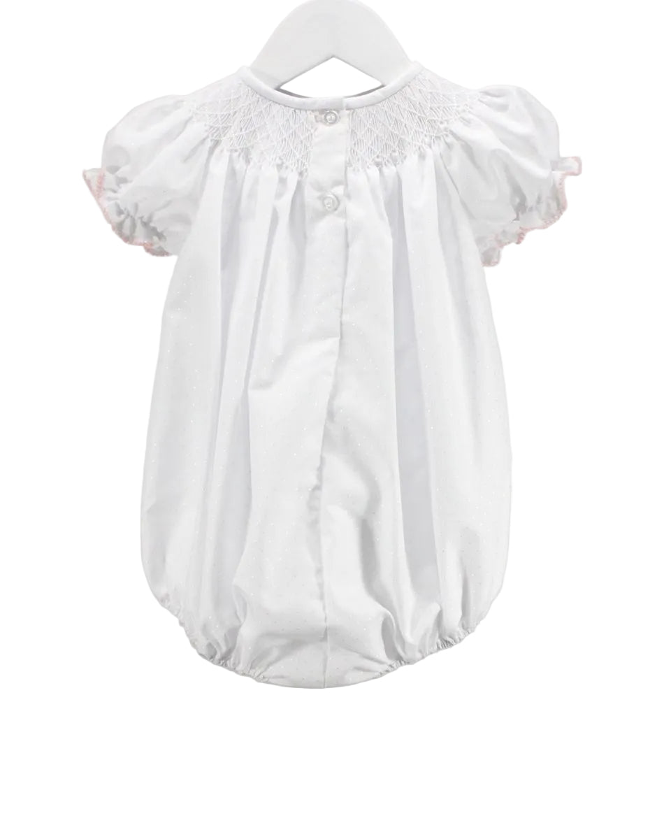We love this baby girl bubble with the precious smocked neckline with pink Crosses for this Easter season.