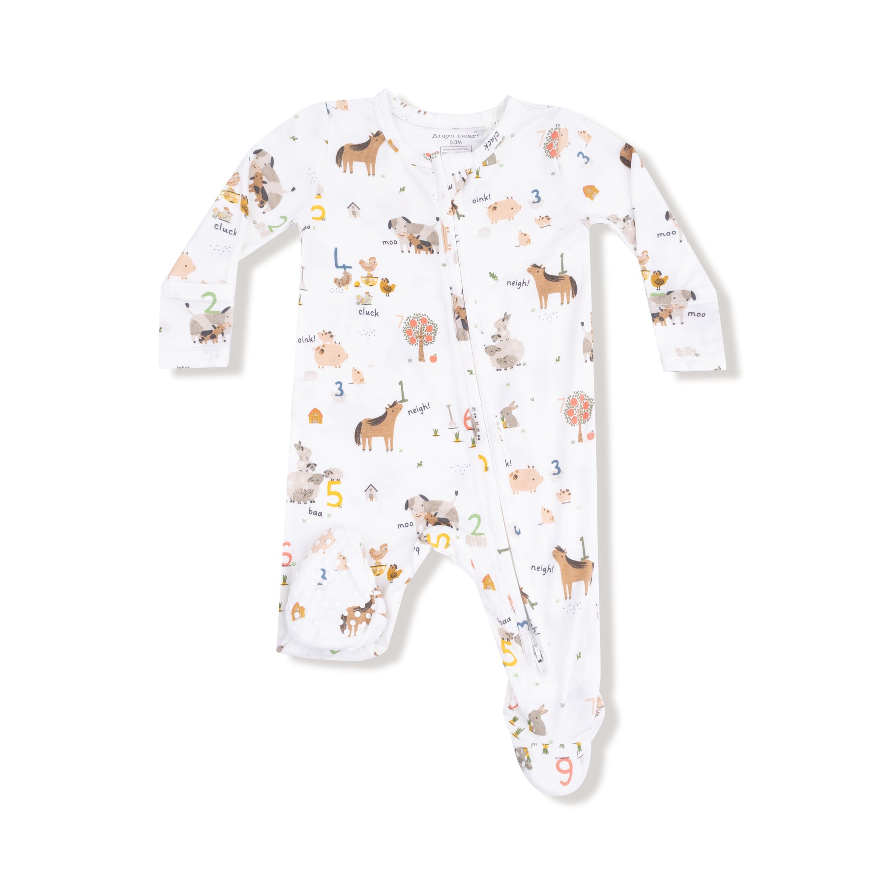 This neutral-colored zipper footie features an adorable farm sounds and counting print, perfect for both baby girls and boys. Made from soft, comfortable fabric, it offers cozy warmth and easy movement. The zipper closure allows for quick dressing and diaper changes, making it a practical and charming choice for everyday wear.
