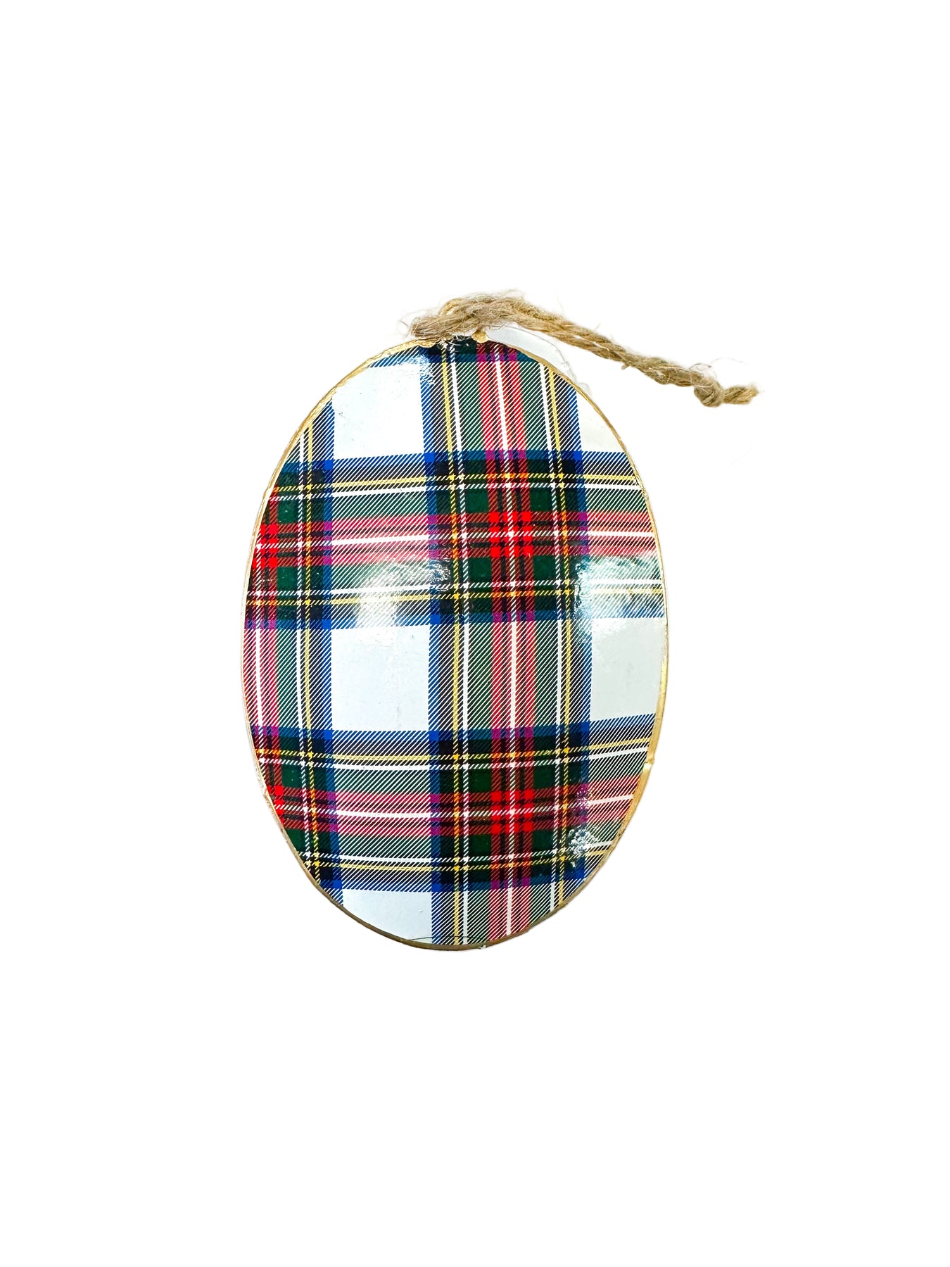Plaid-patterned reverse side of Christmas cardinal ornament.