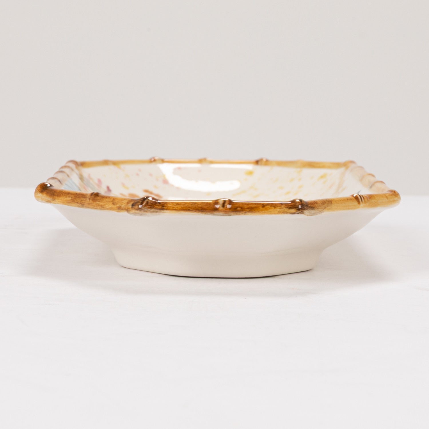 This hand-painted stoneware octagon plate brings a classic chinoiserie scene to life — a detailed house and tree landscape framed by a signature bamboo-style edge in warm, earthy tones. Display it on a plate stand, layer it into a gallery wall, or use it as a decorative catch-all. A charming piece that works as well in a kitchen as it does in a living room.