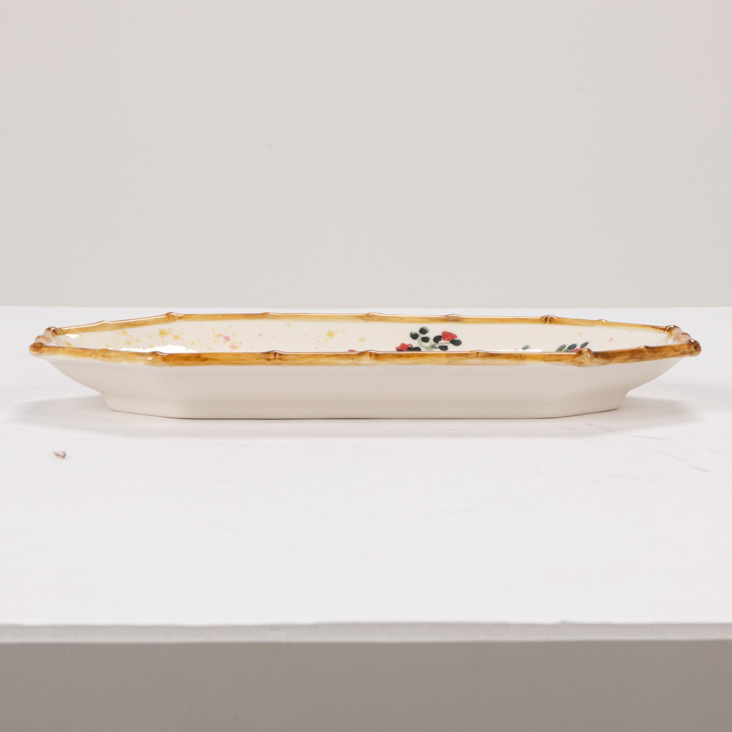 • Hand-painted house and tree chinoiserie motif with bamboo-style edge