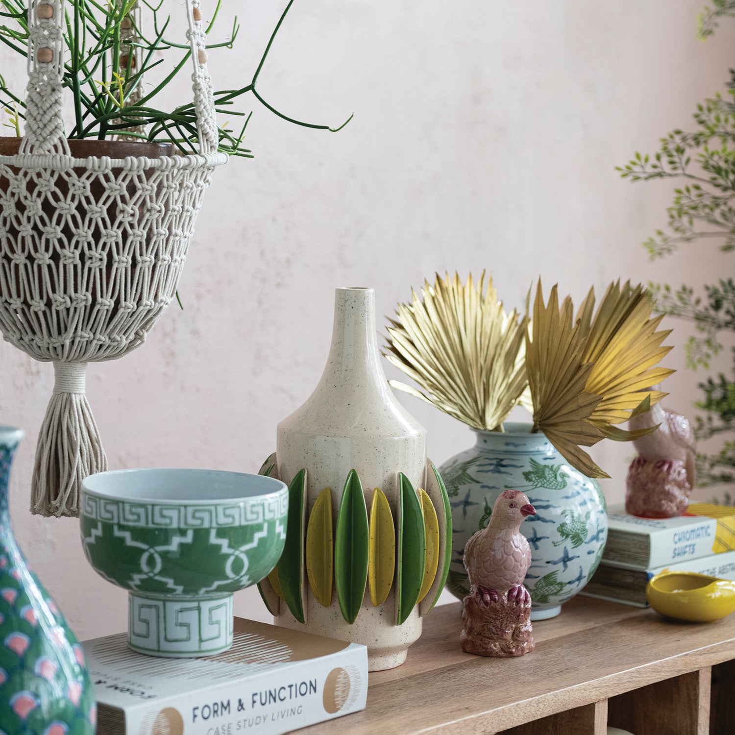 • Hand-painted geometric chinoiserie pattern in green and white