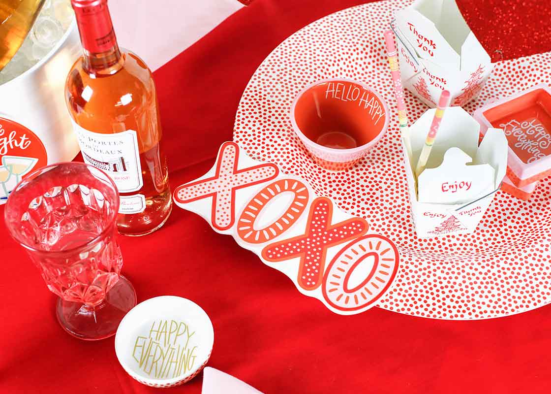 Table setting with a bottle of wine, glasses, and decorative items on a red tablecloth.