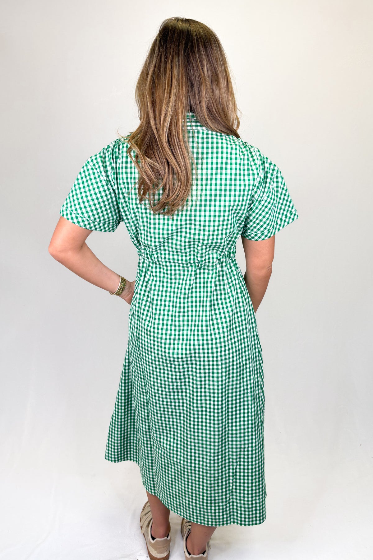 Green gingham midi dress with short sleeves, tie waist, and pockets | Walker Boutique